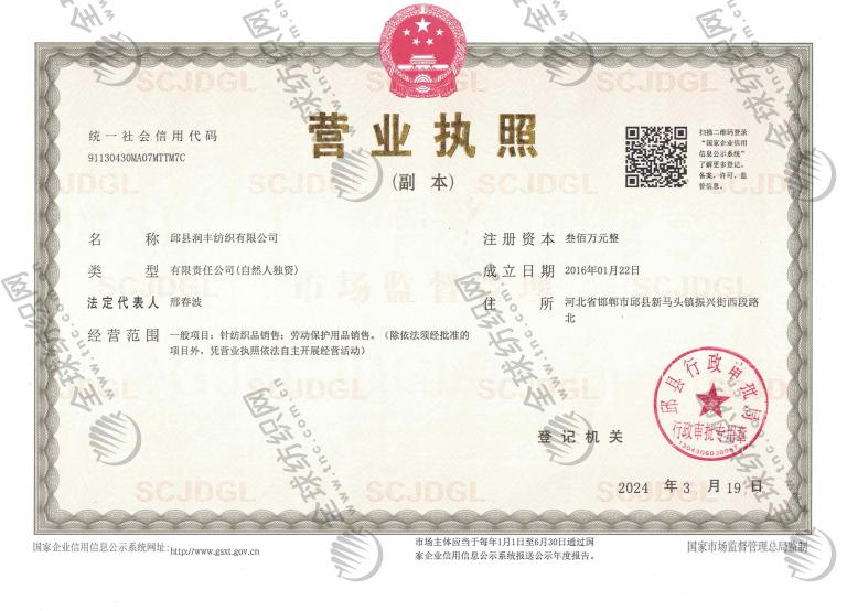 | 统一社会信用代码/营业执照注册号: | 91130430MA07MTTM7C | 名称: | 邱县润丰纺织有限公司 |
